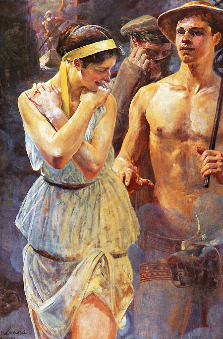 Są wśród nich rycerze, wajdeloci, powstańcy z kosami - konkretni, doskonale realistycznie namalowani - już przy tworzeniu tych pierwszych płócien Malczewski udowodnił, że był dobrym uczniem Matejki. Wszędzie bowiem uderza doskonałość rysunku, perfekcjonizm. Podobnie w "Błędnym kole", gdzie otaczają twórcę (alter ego malarza) siedzącego na szczycie metaforycznej drabiny przeróżne postacie mitologiczne - bachantki, fauny, nimfy. Nad wszystkimi dominuje potężna postać Starca (czyżby samego Pana Boga?).