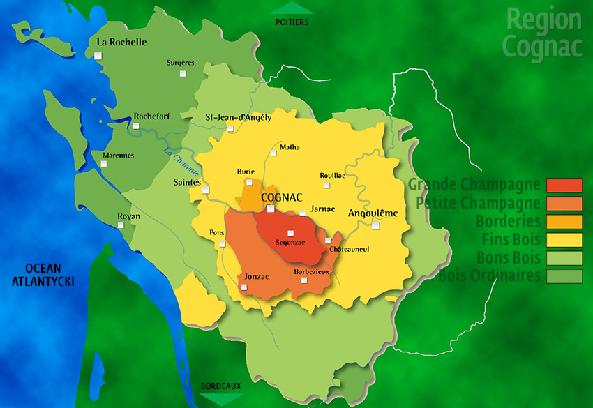 „Petite Champagne”, „Borderies” i „Fins Bois”. Dwa pierwsze regiony (Szampania Duża